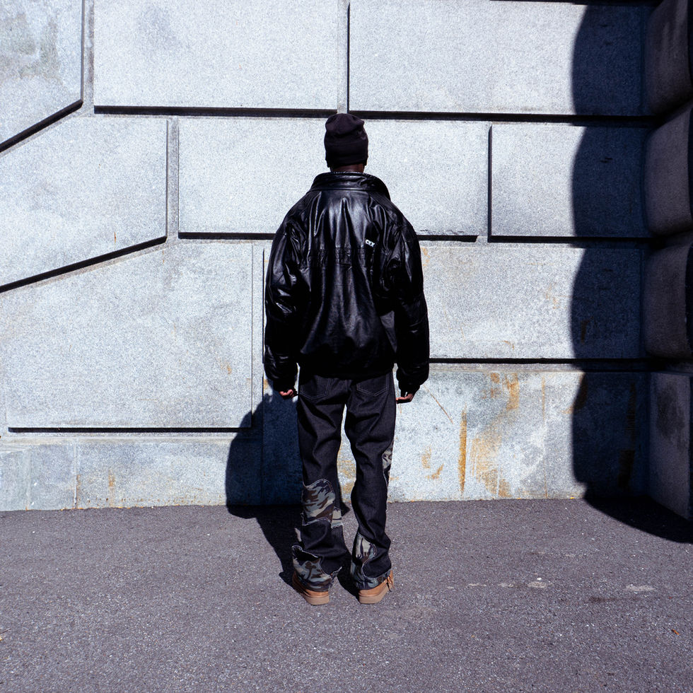Black baggy denim with a classical yet unique silhouette, distressed abstract camo shapes applied, silver hardware and side belts loops